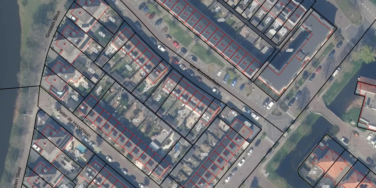 Het perceel waarop van Ruysdaellaan 86 staat heeft een oppervlakte van 528 m². Dit is een groot perceel. De perceeloppervlakte wordt geregistreerd door het Kadaster. Gedetailleerde informatie over de maten van dit perceel kunt u vinden in het rapport Kadastrale kaart met maatvoering van van Ruysdaellaan 86.