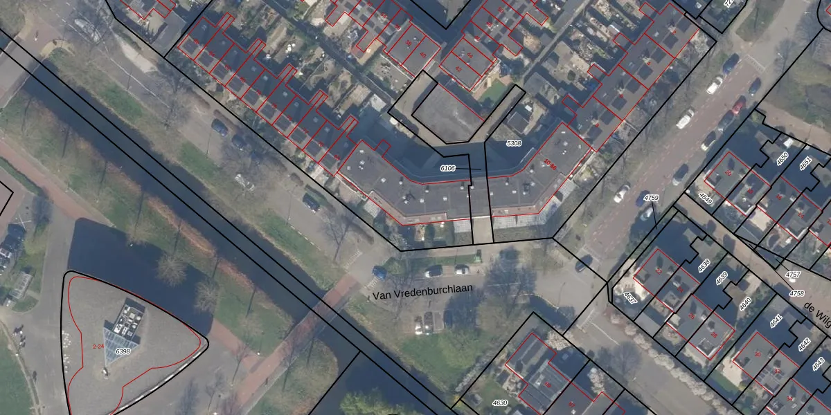 Het perceel waarop Van Vredenburchlaan 44 staat heeft een oppervlakte van 6260 m². Dit is een zeer groot perceel. De perceeloppervlakte wordt geregistreerd door het Kadaster. Gedetailleerde informatie over de maten van dit perceel kunt u vinden in het rapport Kadastrale kaart met maatvoering van Van Vredenburchlaan 44.