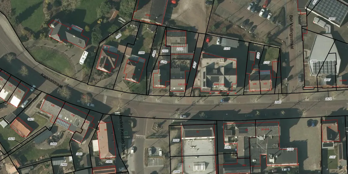 Kanaalstraat 110 is gelegen op kadastraal perceel HDN01H2101. Deze kadastrale aanduiding is uniek en wordt gebruikt door het Kadaster om eigendomsrechten en andere zakelijke rechten vast te leggen. Het perceel maakt onderdeel uit van de kadastrale gemeente Helden.