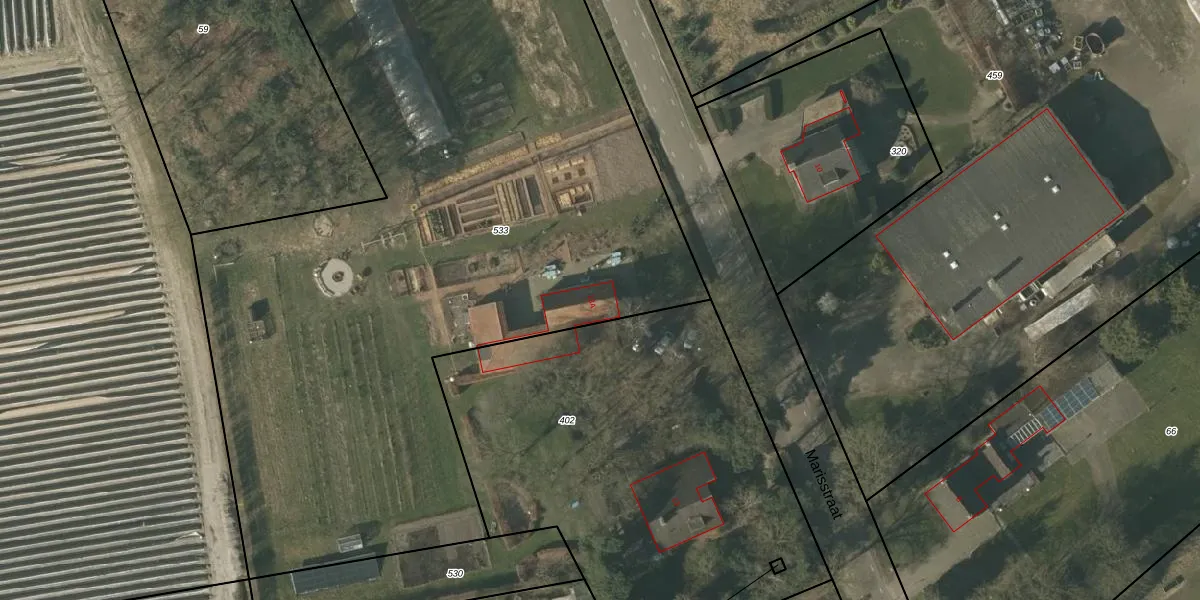 Het perceel waarop Marisstraat 13-A staat heeft een oppervlakte van 6415 m². Dit is een zeer groot perceel. De perceeloppervlakte wordt geregistreerd door het Kadaster. Gedetailleerde informatie over de maten van dit perceel kunt u vinden in het rapport Kadastrale kaart met maatvoering van Marisstraat 13-A.
