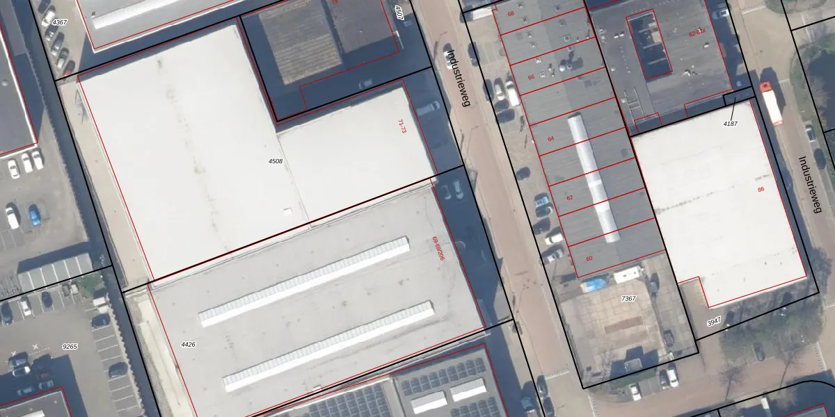 Het perceel waarop Industrieweg 69-56 staat heeft een oppervlakte van 3399 m². Dit is een zeer groot perceel. De perceeloppervlakte wordt geregistreerd door het Kadaster. Gedetailleerde informatie over de maten van dit perceel kunt u vinden in het rapport Kadastrale kaart met maatvoering van Industrieweg 69-56.