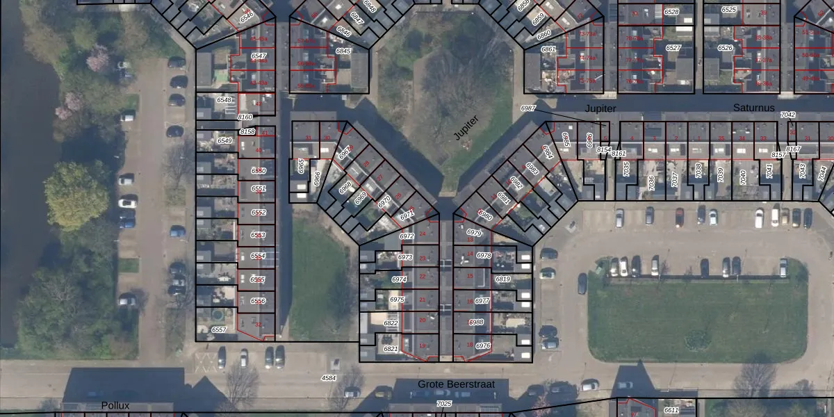 Het perceel waarop Jupiter 25 staat heeft een oppervlakte van 95 m². Dit is een klein perceel. De perceeloppervlakte wordt geregistreerd door het Kadaster. Gedetailleerde informatie over de maten van dit perceel kunt u vinden in het rapport Kadastrale kaart met maatvoering van Jupiter 25.
