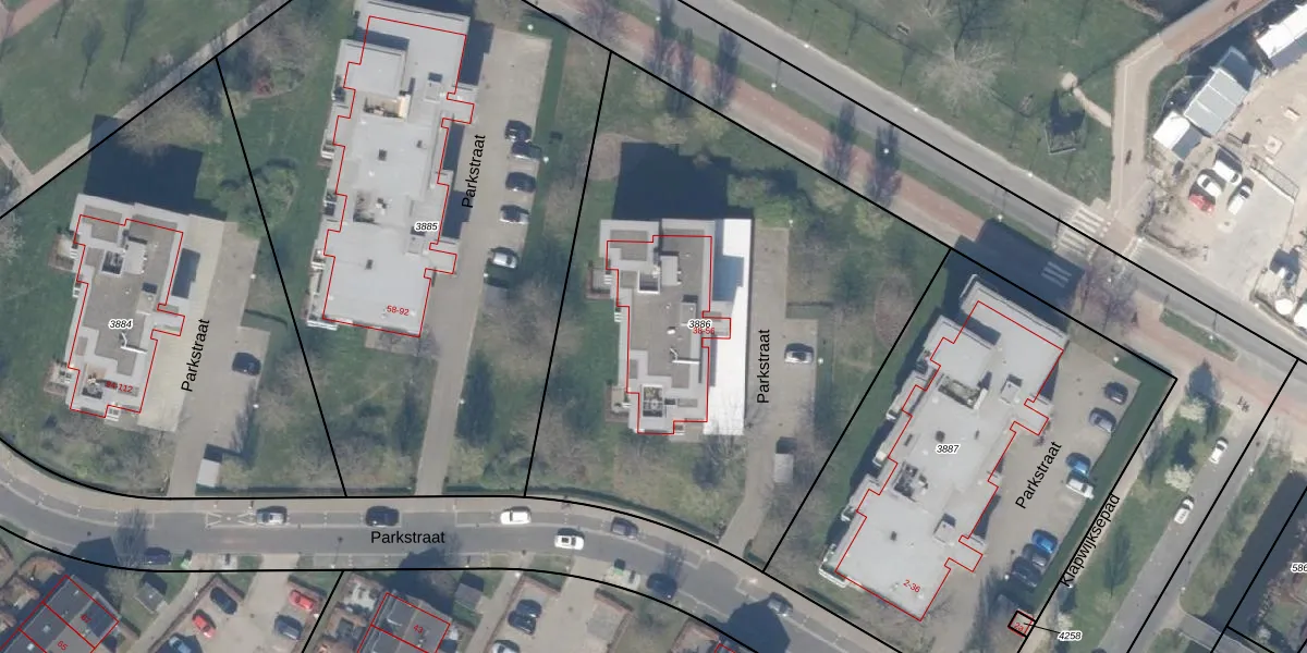 Het perceel waarop Parkstraat 46 staat heeft een oppervlakte van 2990 m². Dit is een zeer groot perceel. De perceeloppervlakte wordt geregistreerd door het Kadaster. Gedetailleerde informatie over de maten van dit perceel kunt u vinden in het rapport Kadastrale kaart met maatvoering van Parkstraat 46.