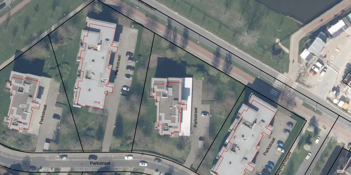 Het perceel waarop Parkstraat 56 staat heeft een oppervlakte van 2990 m². Dit is een zeer groot perceel. De perceeloppervlakte wordt geregistreerd door het Kadaster. Gedetailleerde informatie over de maten van dit perceel kunt u vinden in het rapport Kadastrale kaart met maatvoering van Parkstraat 56.