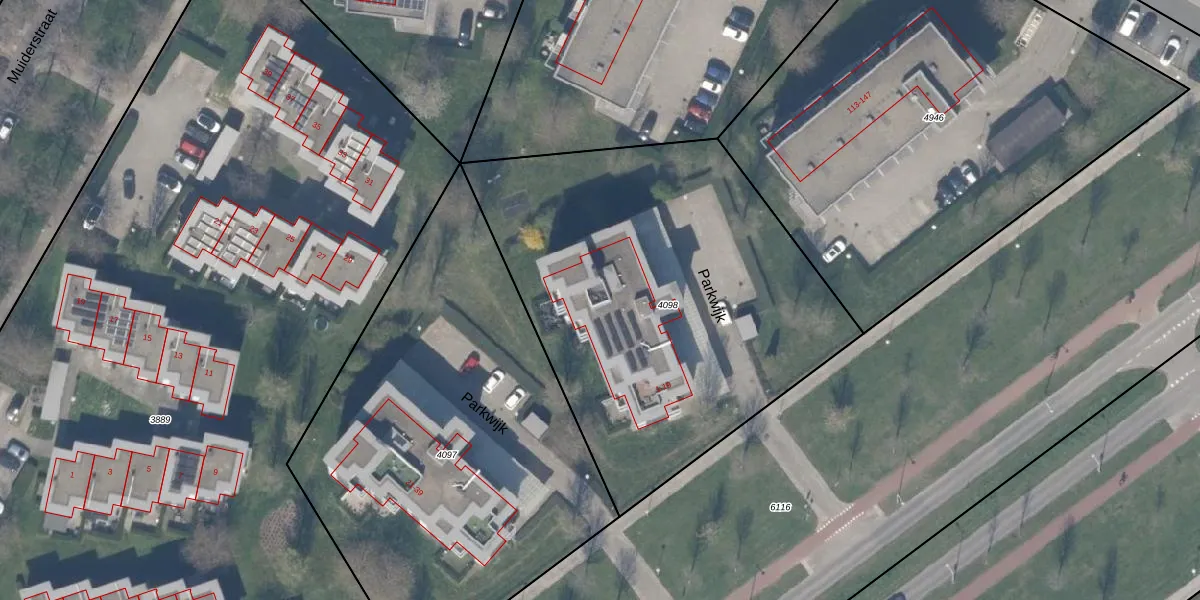 Het perceel waarop Parkwijk 15 staat heeft een oppervlakte van 2355 m². Dit is een zeer groot perceel. De perceeloppervlakte wordt geregistreerd door het Kadaster. Gedetailleerde informatie over de maten van dit perceel kunt u vinden in het rapport Kadastrale kaart met maatvoering van Parkwijk 15.