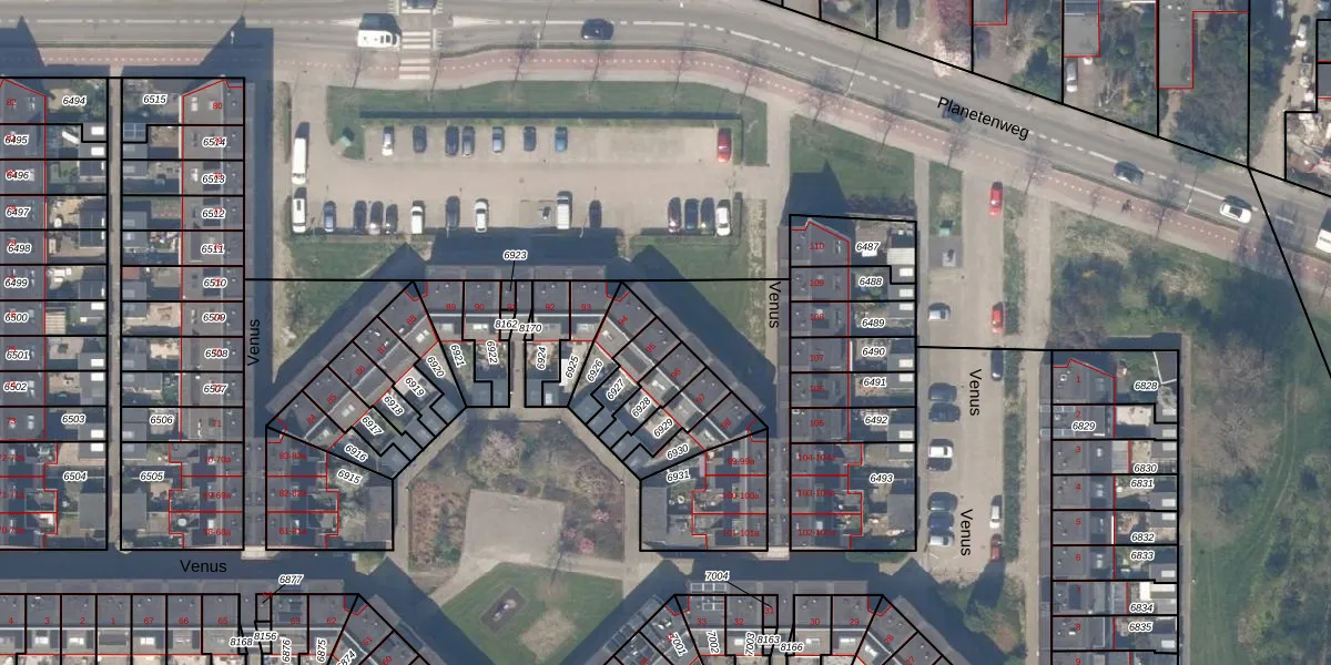 Het perceel waarop Venus 95 staat heeft een oppervlakte van 86 m². Dit is een klein perceel. De perceeloppervlakte wordt geregistreerd door het Kadaster. Gedetailleerde informatie over de maten van dit perceel kunt u vinden in het rapport Kadastrale kaart met maatvoering van Venus 95.