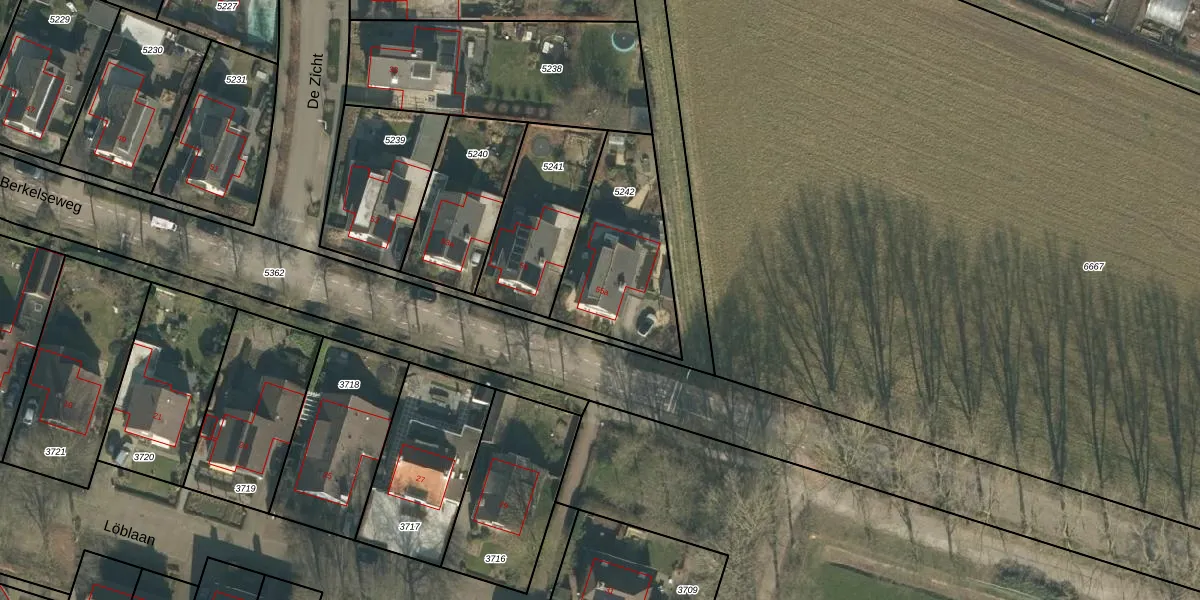Het perceel waarop Berkelseweg 55-a staat heeft een oppervlakte van 519 m². Dit is een groot perceel. De perceeloppervlakte wordt geregistreerd door het Kadaster. Gedetailleerde informatie over de maten van dit perceel kunt u vinden in het rapport Kadastrale kaart met maatvoering van Berkelseweg 55-a.