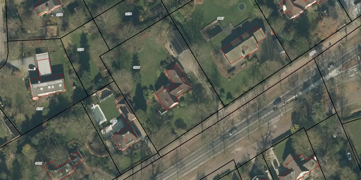 Het perceel waarop Bosscheweg 20 staat heeft een oppervlakte van 2745 m². Dit is een zeer groot perceel. De perceeloppervlakte wordt geregistreerd door het Kadaster. Gedetailleerde informatie over de maten van dit perceel kunt u vinden in het rapport Kadastrale kaart met maatvoering van Bosscheweg 20.