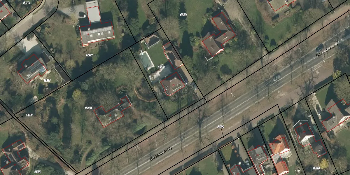 Het perceel waarop Bosscheweg 22 staat heeft een oppervlakte van 1067 m². Dit is een zeer groot perceel. De perceeloppervlakte wordt geregistreerd door het Kadaster. Gedetailleerde informatie over de maten van dit perceel kunt u vinden in het rapport Kadastrale kaart met maatvoering van Bosscheweg 22.