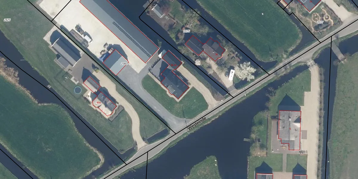 Het perceel waarop Westeinde 38 staat heeft een oppervlakte van 3910 m². Dit is een zeer groot perceel. De perceeloppervlakte wordt geregistreerd door het Kadaster. Gedetailleerde informatie over de maten van dit perceel kunt u vinden in het rapport Kadastrale kaart met maatvoering van Westeinde 38.