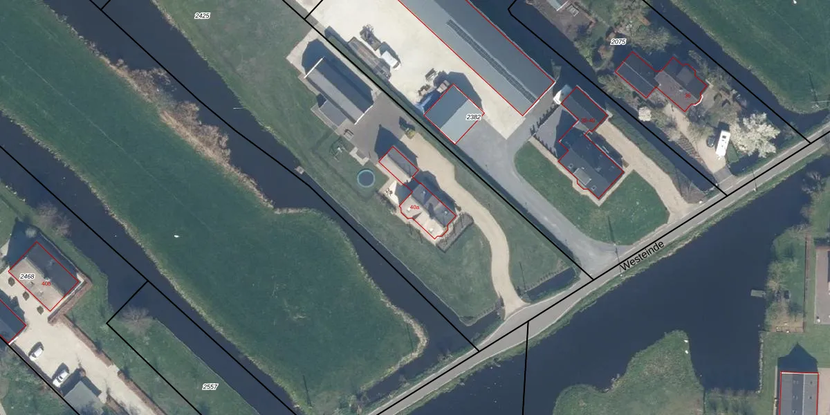 Het perceel waarop Westeinde 40-a staat heeft een oppervlakte van 3875 m². Dit is een zeer groot perceel. De perceeloppervlakte wordt geregistreerd door het Kadaster. Gedetailleerde informatie over de maten van dit perceel kunt u vinden in het rapport Kadastrale kaart met maatvoering van Westeinde 40-a.