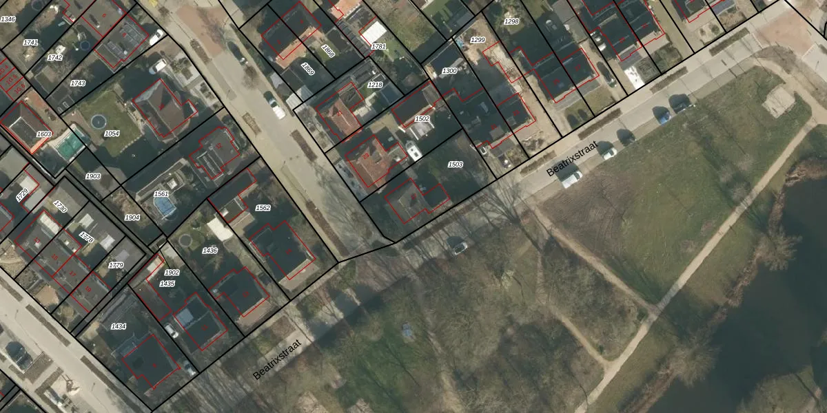 Het perceel waarop Beatrixstraat 17 staat heeft een oppervlakte van 427 m². Dit is een groot perceel. De perceeloppervlakte wordt geregistreerd door het Kadaster. Gedetailleerde informatie over de maten van dit perceel kunt u vinden in het rapport Kadastrale kaart met maatvoering van Beatrixstraat 17.
