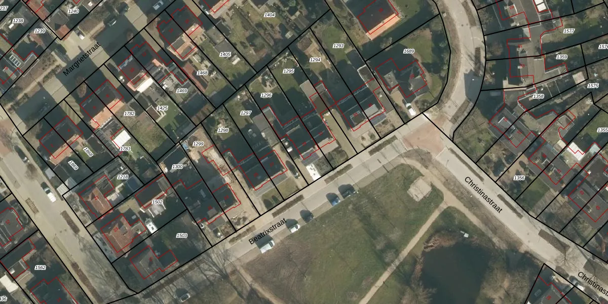 Het perceel waarop Beatrixstraat 29 staat heeft een oppervlakte van 376 m². Dit is een groot perceel. De perceeloppervlakte wordt geregistreerd door het Kadaster. Gedetailleerde informatie over de maten van dit perceel kunt u vinden in het rapport Kadastrale kaart met maatvoering van Beatrixstraat 29.