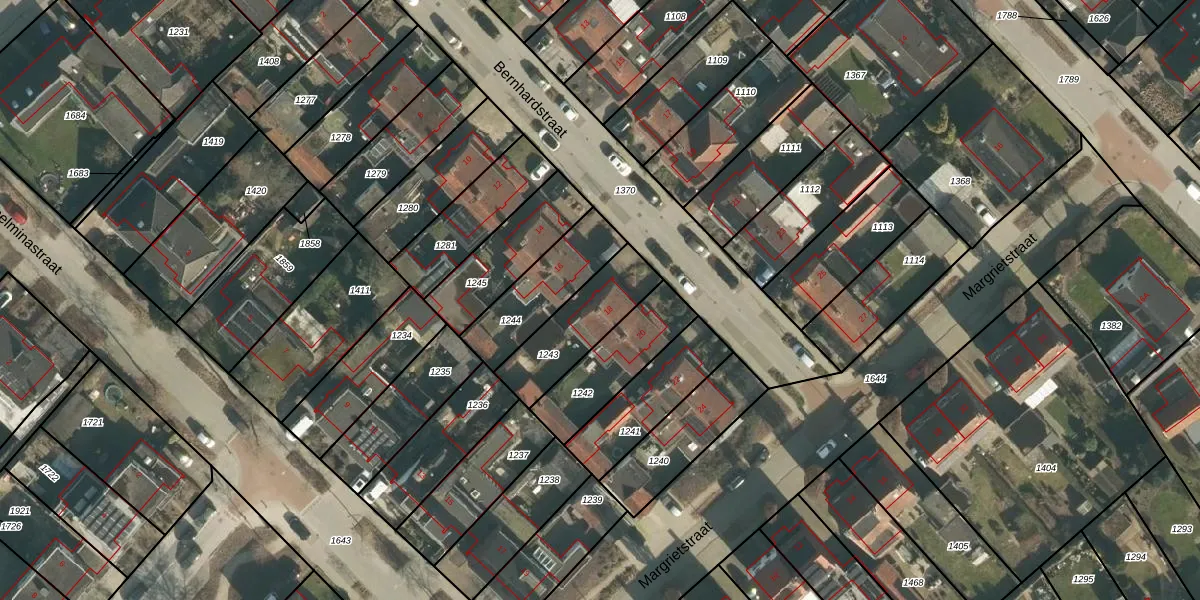 Het perceel waarop Bernhardstraat 18 staat heeft een oppervlakte van 262 m². Dit is een middelgroot perceel. De perceeloppervlakte wordt geregistreerd door het Kadaster. Gedetailleerde informatie over de maten van dit perceel kunt u vinden in het rapport Kadastrale kaart met maatvoering van Bernhardstraat 18.