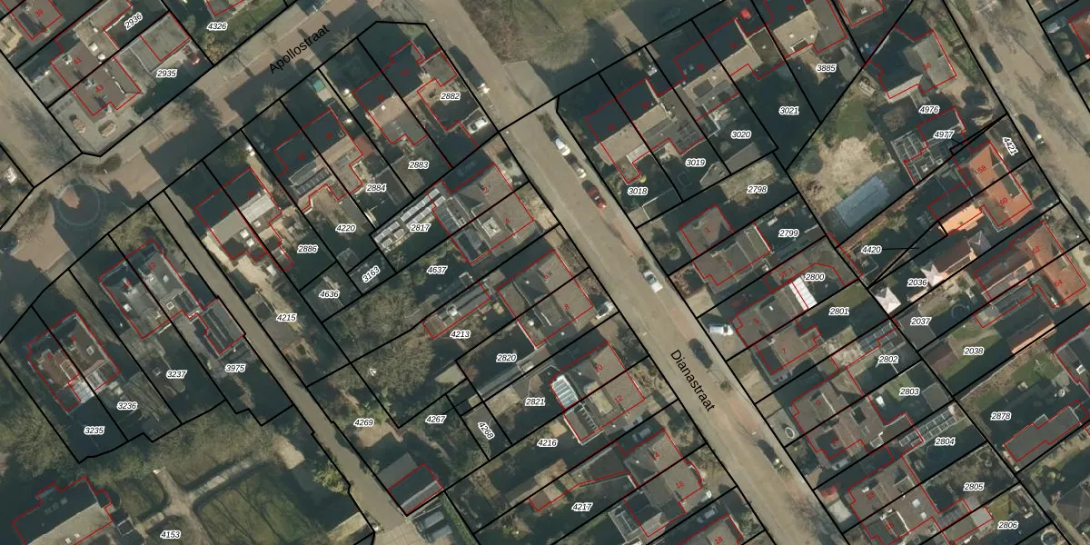 Dianastraat 6 is gelegen op kadastraal perceel BLC00H4213. Deze kadastrale aanduiding is uniek en wordt gebruikt door het Kadaster om eigendomsrechten en andere zakelijke rechten vast te leggen. Het perceel maakt onderdeel uit van de kadastrale gemeente Berlicum.