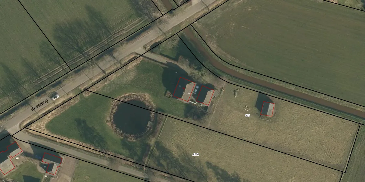 Het perceel waarop Koesteeg 26 staat heeft een oppervlakte van 4190 m². Dit is een zeer groot perceel. De perceeloppervlakte wordt geregistreerd door het Kadaster. Gedetailleerde informatie over de maten van dit perceel kunt u vinden in het rapport Kadastrale kaart met maatvoering van Koesteeg 26.