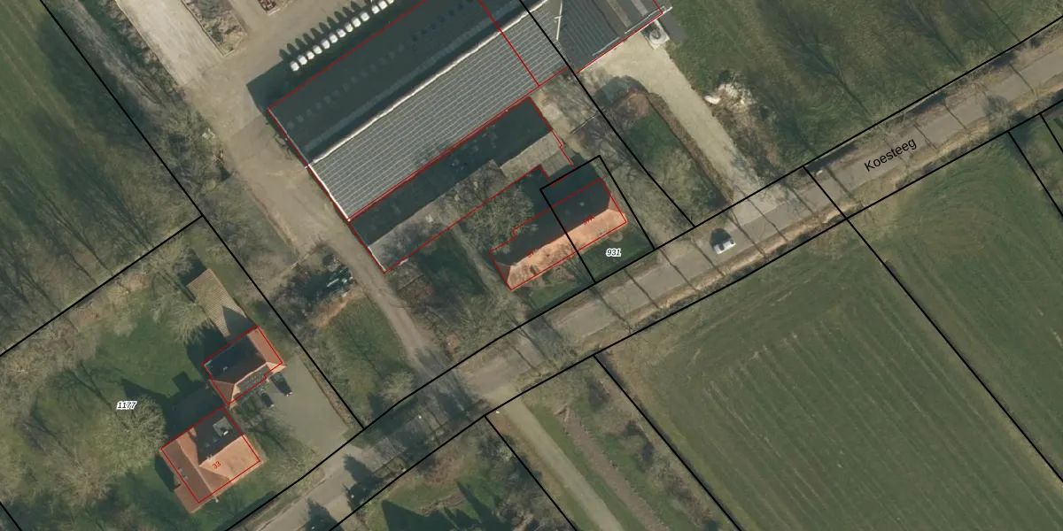 Het perceel waarop Koesteeg 37 staat heeft een oppervlakte van 2,8 ha. Dit is een zeer groot perceel. De perceeloppervlakte wordt geregistreerd door het Kadaster. Gedetailleerde informatie over de maten van dit perceel kunt u vinden in het rapport Kadastrale kaart met maatvoering van Koesteeg 37.