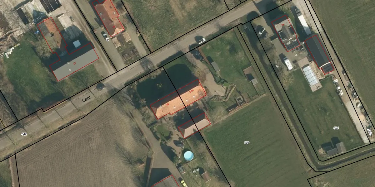 Het perceel waarop Laar 32-A staat heeft een oppervlakte van 5385 m². Dit is een zeer groot perceel. De perceeloppervlakte wordt geregistreerd door het Kadaster. Gedetailleerde informatie over de maten van dit perceel kunt u vinden in het rapport Kadastrale kaart met maatvoering van Laar 32-A.