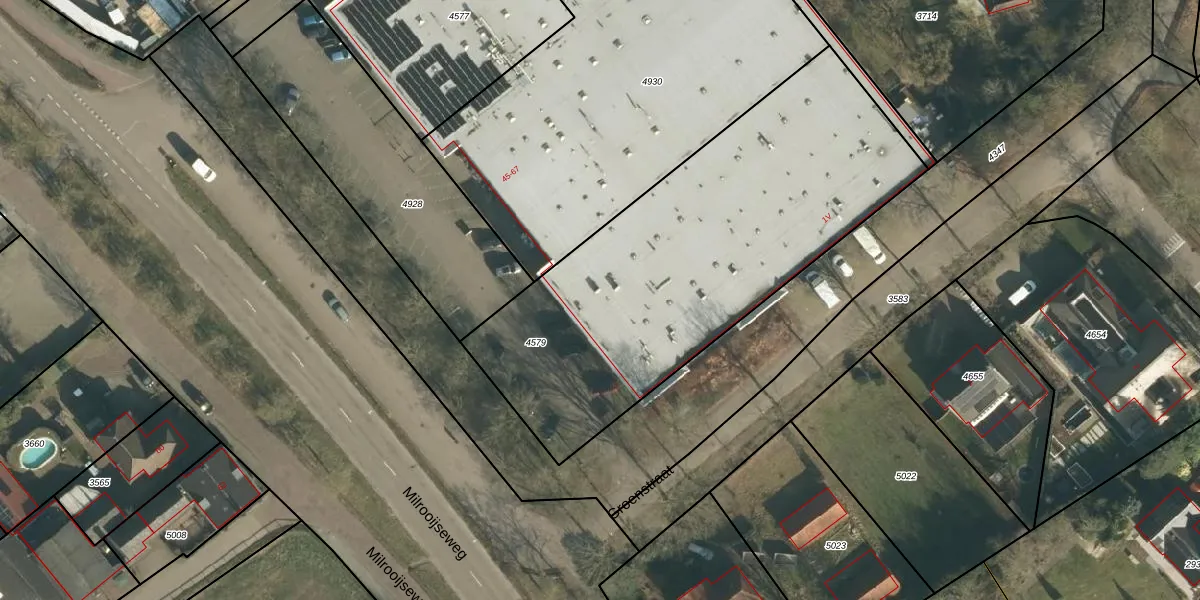 Het perceel waarop Milrooijseweg 55 staat heeft een oppervlakte van 2083 m². Dit is een zeer groot perceel. De perceeloppervlakte wordt geregistreerd door het Kadaster. Gedetailleerde informatie over de maten van dit perceel kunt u vinden in het rapport Kadastrale kaart met maatvoering van Milrooijseweg 55.