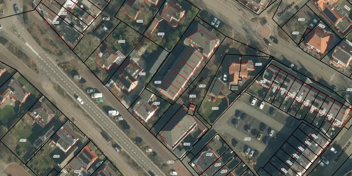 Het perceel waarop Muldershof 16 staat heeft een oppervlakte van 997 m². Dit is een groot perceel. De perceeloppervlakte wordt geregistreerd door het Kadaster. Gedetailleerde informatie over de maten van dit perceel kunt u vinden in het rapport Kadastrale kaart met maatvoering van Muldershof 16.