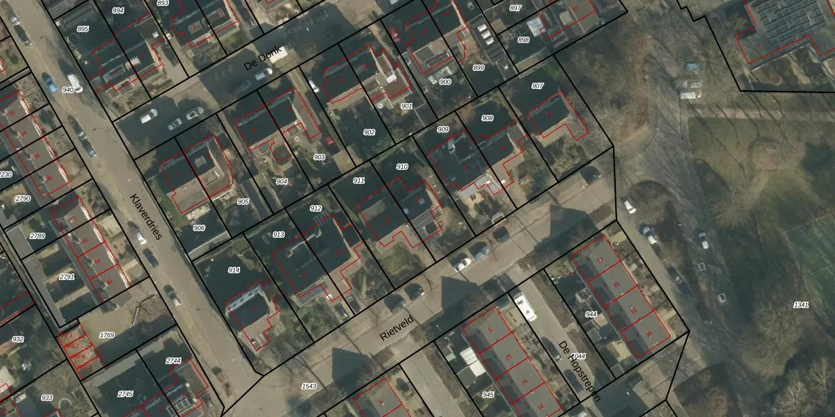 Het perceel waarop Rietveld 15 staat heeft een oppervlakte van 338 m². Dit is een groot perceel. De perceeloppervlakte wordt geregistreerd door het Kadaster. Gedetailleerde informatie over de maten van dit perceel kunt u vinden in het rapport Kadastrale kaart met maatvoering van Rietveld 15.