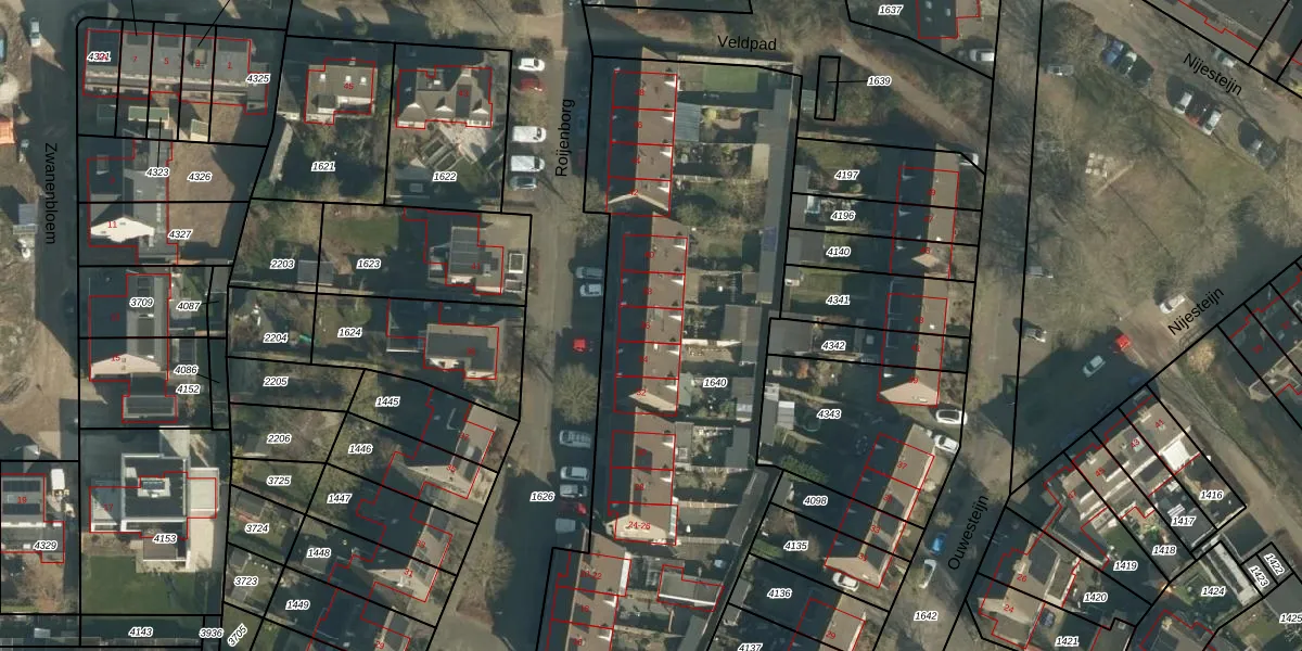 Het perceel waarop Roijenborg 36 staat heeft een oppervlakte van 2788 m². Dit is een zeer groot perceel. De perceeloppervlakte wordt geregistreerd door het Kadaster. Gedetailleerde informatie over de maten van dit perceel kunt u vinden in het rapport Kadastrale kaart met maatvoering van Roijenborg 36.