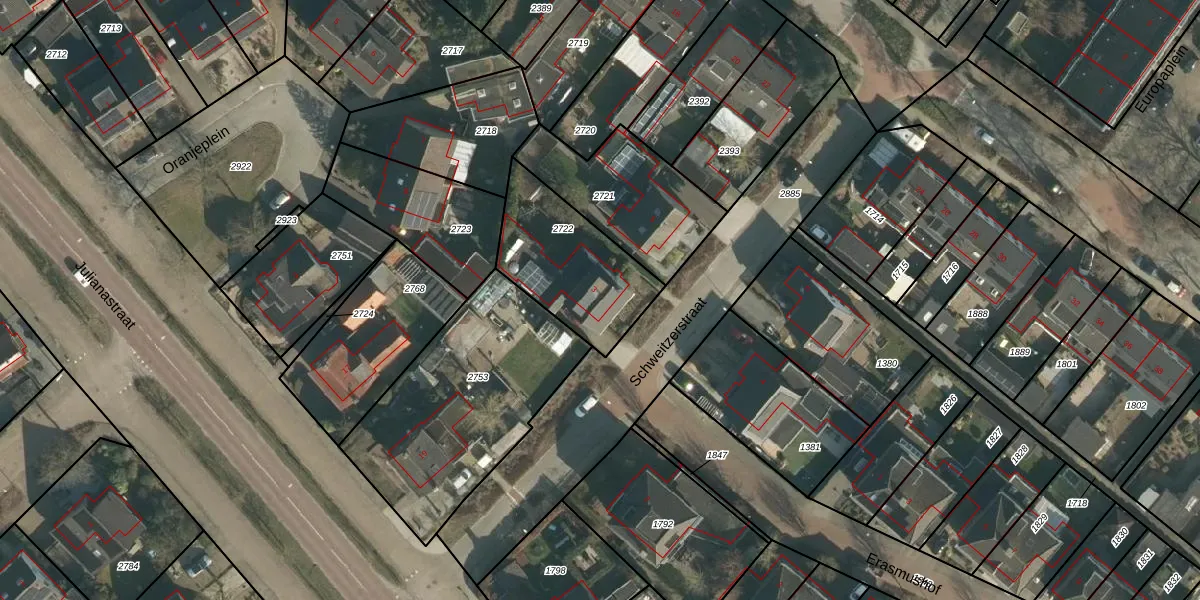 Het perceel waarop Schweitzerstraat 3 staat heeft een oppervlakte van 450 m². Dit is een groot perceel. De perceeloppervlakte wordt geregistreerd door het Kadaster. Gedetailleerde informatie over de maten van dit perceel kunt u vinden in het rapport Kadastrale kaart met maatvoering van Schweitzerstraat 3.