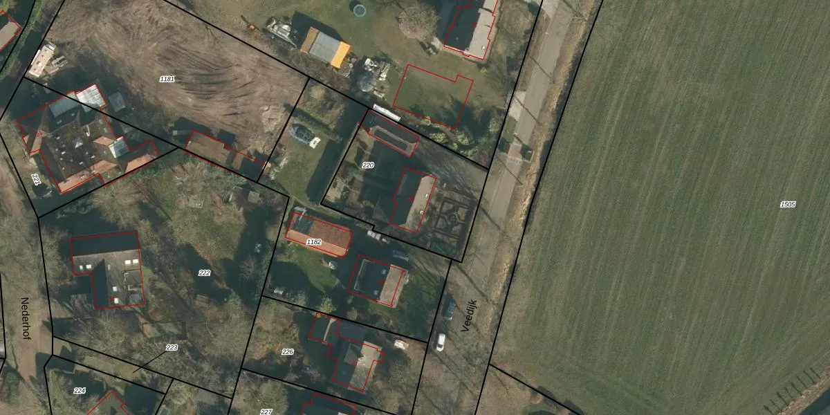 Het perceel waarop Veedijk 25 staat heeft een oppervlakte van 860 m². Dit is een groot perceel. De perceeloppervlakte wordt geregistreerd door het Kadaster. Gedetailleerde informatie over de maten van dit perceel kunt u vinden in het rapport Kadastrale kaart met maatvoering van Veedijk 25.