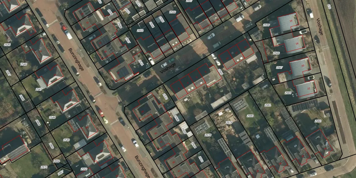 Het perceel waarop Voshage 2 staat heeft een oppervlakte van 1545 m². Dit is een zeer groot perceel. De perceeloppervlakte wordt geregistreerd door het Kadaster. Gedetailleerde informatie over de maten van dit perceel kunt u vinden in het rapport Kadastrale kaart met maatvoering van Voshage 2.