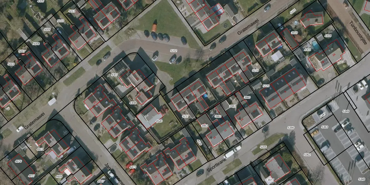 Het perceel waarop Gratemawei 15 staat heeft een oppervlakte van 1800 m². Dit is een zeer groot perceel. De perceeloppervlakte wordt geregistreerd door het Kadaster. Gedetailleerde informatie over de maten van dit perceel kunt u vinden in het rapport Kadastrale kaart met maatvoering van Gratemawei 15.
