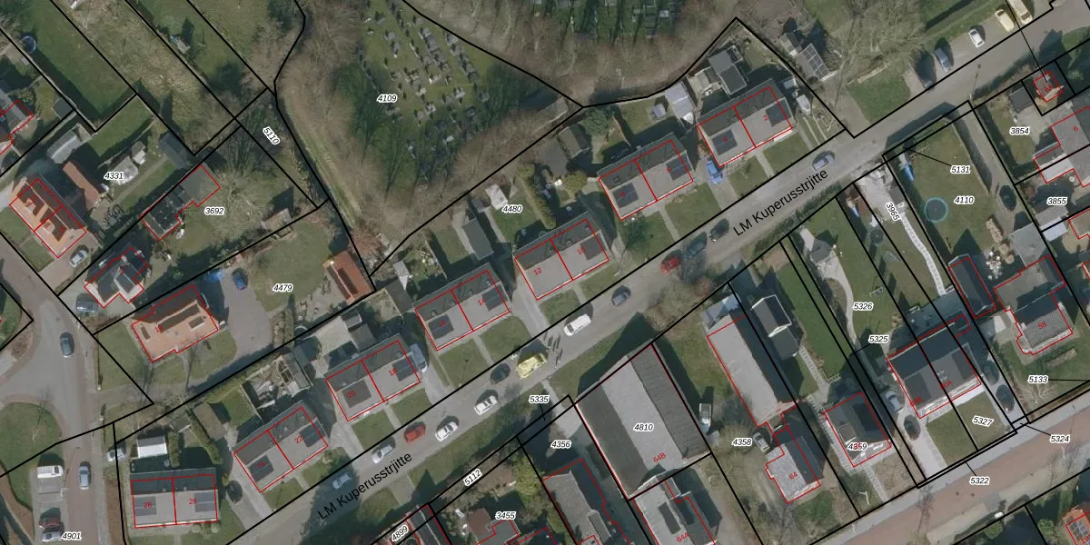 Het perceel waarop LM Kuperusstrjitte 12 staat heeft een oppervlakte van 3973 m². Dit is een zeer groot perceel. De perceeloppervlakte wordt geregistreerd door het Kadaster. Gedetailleerde informatie over de maten van dit perceel kunt u vinden in het rapport Kadastrale kaart met maatvoering van LM Kuperusstrjitte 12.