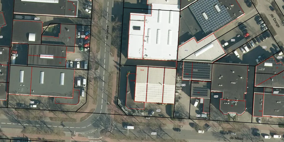 Het perceel waarop de Dieze 61-A staat heeft een oppervlakte van 1375 m². Dit is een zeer groot perceel. De perceeloppervlakte wordt geregistreerd door het Kadaster. Gedetailleerde informatie over de maten van dit perceel kunt u vinden in het rapport Kadastrale kaart met maatvoering van de Dieze 61-A.