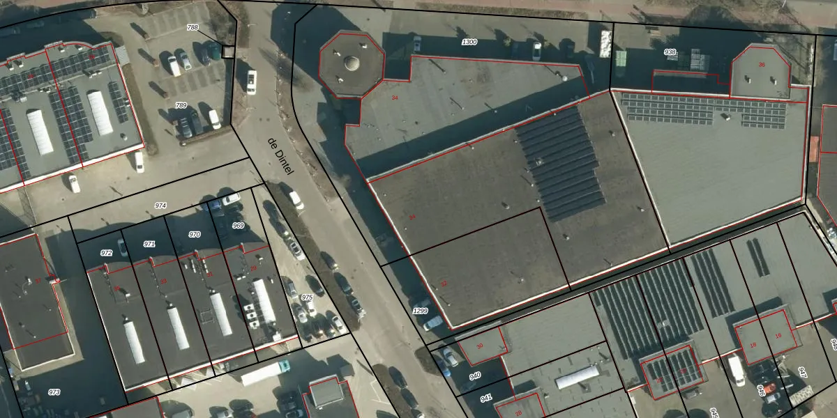 Het perceel waarop de Dintel 34 staat heeft een oppervlakte van 4275 m². Dit is een zeer groot perceel. De perceeloppervlakte wordt geregistreerd door het Kadaster. Gedetailleerde informatie over de maten van dit perceel kunt u vinden in het rapport Kadastrale kaart met maatvoering van de Dintel 34.