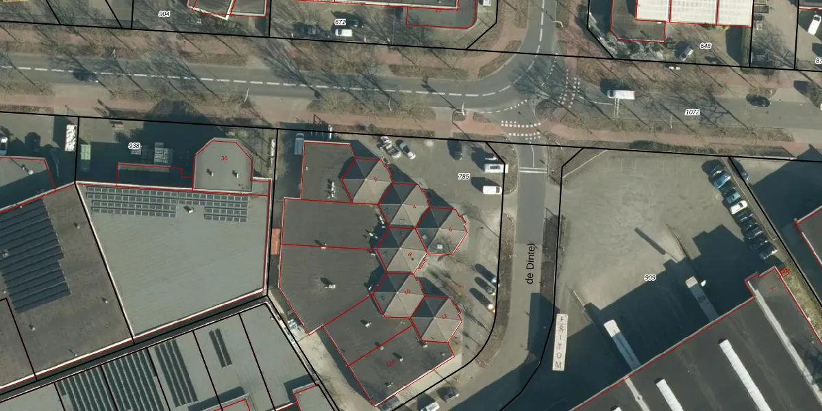 Het perceel waarop de Dintel 4 staat heeft een oppervlakte van 3300 m². Dit is een zeer groot perceel. De perceeloppervlakte wordt geregistreerd door het Kadaster. Gedetailleerde informatie over de maten van dit perceel kunt u vinden in het rapport Kadastrale kaart met maatvoering van de Dintel 4.