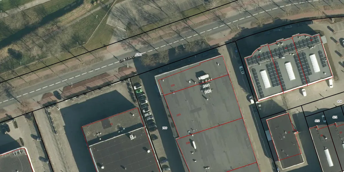 Het perceel waarop de Maas 22-A staat heeft een oppervlakte van 1,2 ha. Dit is een zeer groot perceel. De perceeloppervlakte wordt geregistreerd door het Kadaster. Gedetailleerde informatie over de maten van dit perceel kunt u vinden in het rapport Kadastrale kaart met maatvoering van de Maas 22-A.