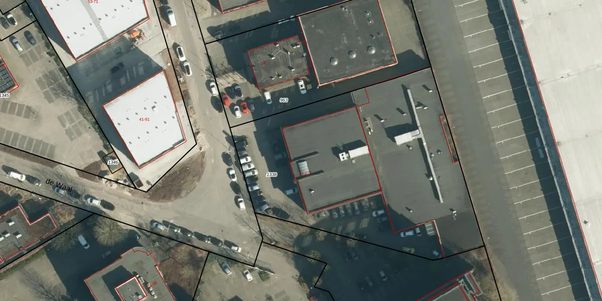Het perceel waarop de Waal 42-A staat heeft een oppervlakte van 3469 m². Dit is een zeer groot perceel. De perceeloppervlakte wordt geregistreerd door het Kadaster. Gedetailleerde informatie over de maten van dit perceel kunt u vinden in het rapport Kadastrale kaart met maatvoering van de Waal 42-A.