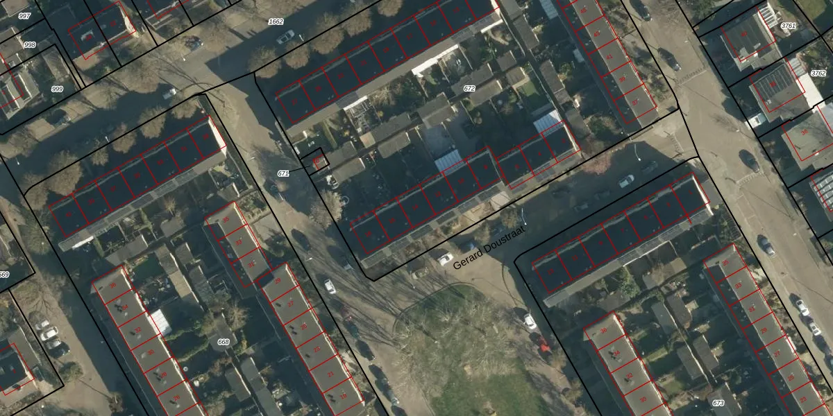 Gerard Doustraat 14 is gelegen op kadastraal perceel BES00H672. Deze kadastrale aanduiding is uniek en wordt gebruikt door het Kadaster om eigendomsrechten en andere zakelijke rechten vast te leggen. Het perceel maakt onderdeel uit van de kadastrale gemeente Best.