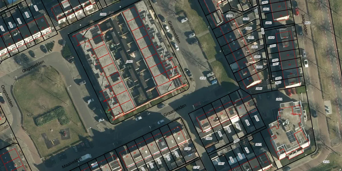 Het perceel waarop Graanvelden 26 staat heeft een oppervlakte van 3038 m². Dit is een zeer groot perceel. De perceeloppervlakte wordt geregistreerd door het Kadaster. Gedetailleerde informatie over de maten van dit perceel kunt u vinden in het rapport Kadastrale kaart met maatvoering van Graanvelden 26.