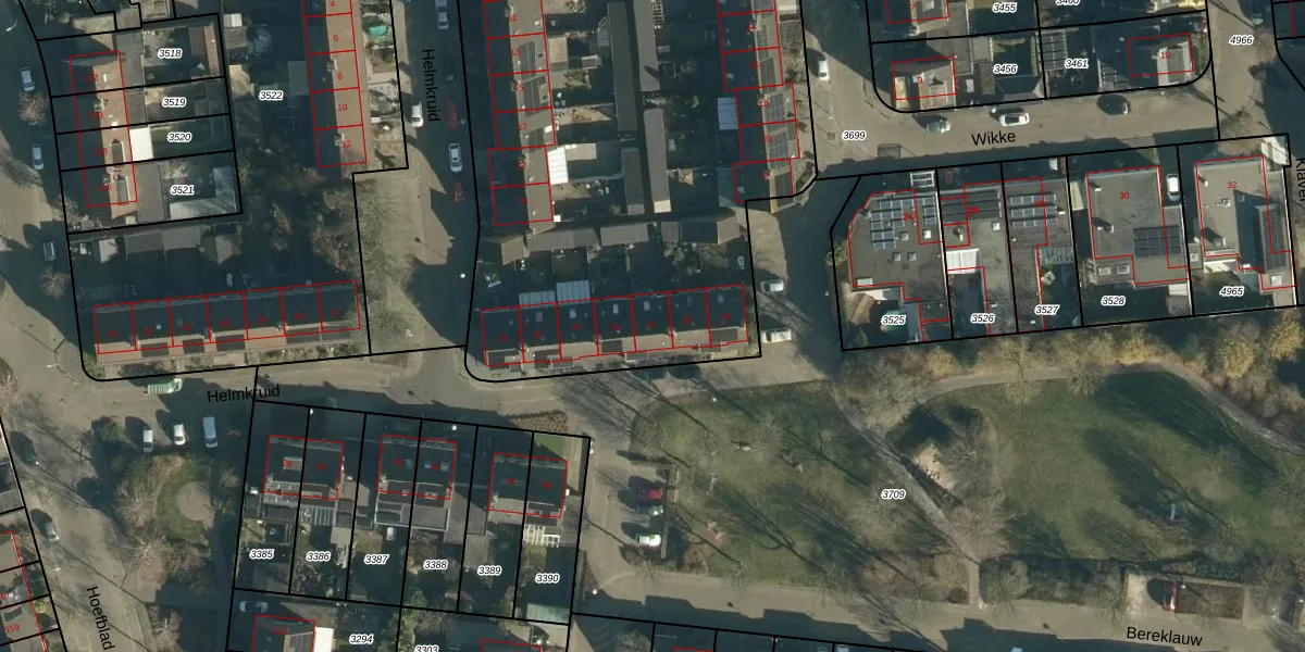 Het perceel waarop Helmkruid 31 staat heeft een oppervlakte van 5770 m². Dit is een zeer groot perceel. De perceeloppervlakte wordt geregistreerd door het Kadaster. Gedetailleerde informatie over de maten van dit perceel kunt u vinden in het rapport Kadastrale kaart met maatvoering van Helmkruid 31.