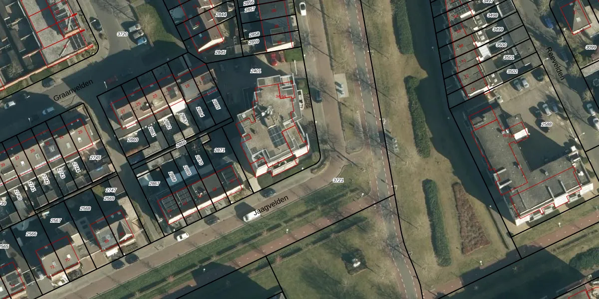 Jaagvelden 36 is gelegen op kadastraal perceel BES00K2401. Deze kadastrale aanduiding is uniek en wordt gebruikt door het Kadaster om eigendomsrechten en andere zakelijke rechten vast te leggen. Het perceel maakt onderdeel uit van de kadastrale gemeente Best.