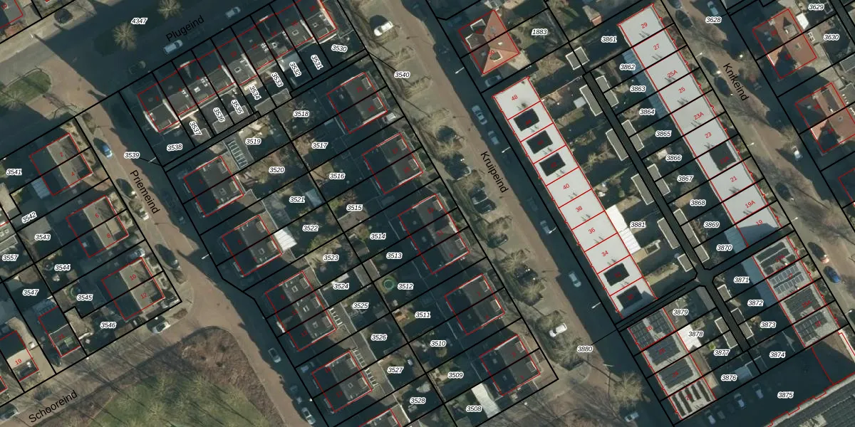 Kruipeind 13 is gelegen op kadastraal perceel BES00K3514. Deze kadastrale aanduiding is uniek en wordt gebruikt door het Kadaster om eigendomsrechten en andere zakelijke rechten vast te leggen. Het perceel maakt onderdeel uit van de kadastrale gemeente Best.