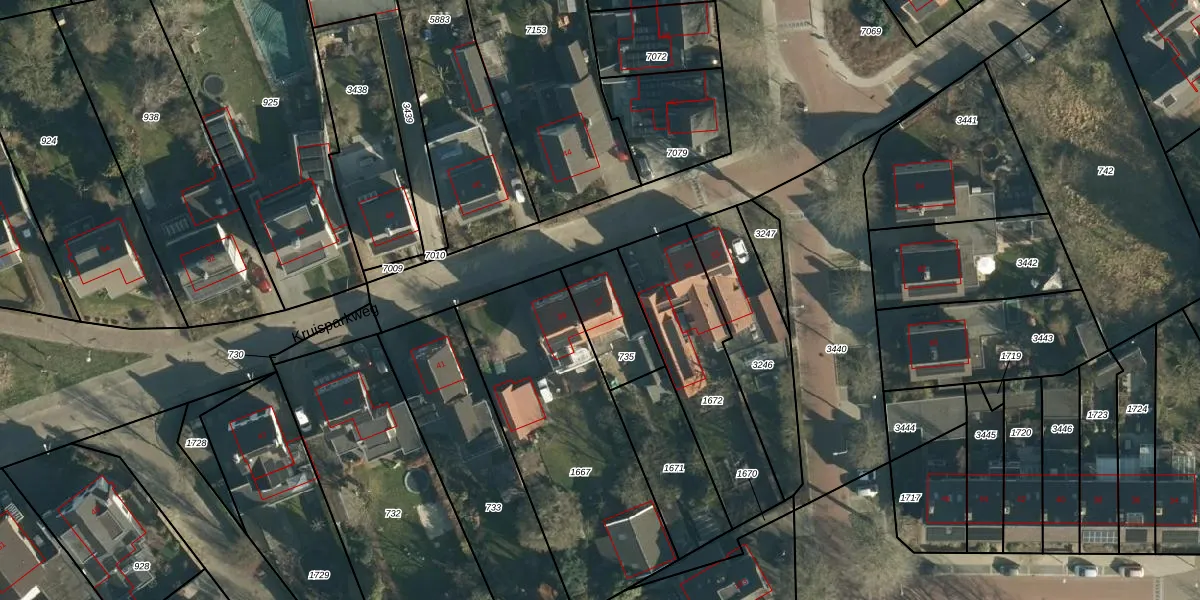 Het perceel waarop Kruisparkweg 37 staat heeft een oppervlakte van 215 m². Dit is een middelgroot perceel. De perceeloppervlakte wordt geregistreerd door het Kadaster. Gedetailleerde informatie over de maten van dit perceel kunt u vinden in het rapport Kadastrale kaart met maatvoering van Kruisparkweg 37.