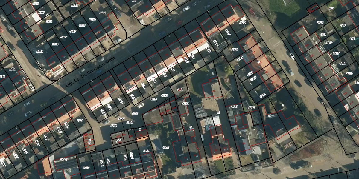 Het perceel waarop Mgr. Dr. Th. Goossensstraat 607 staat heeft een oppervlakte van 71 m². Dit is een klein perceel. De perceeloppervlakte wordt geregistreerd door het Kadaster. Gedetailleerde informatie over de maten van dit perceel kunt u vinden in het rapport Kadastrale kaart met maatvoering van Mgr. Dr. Th. Goossensstraat 607.