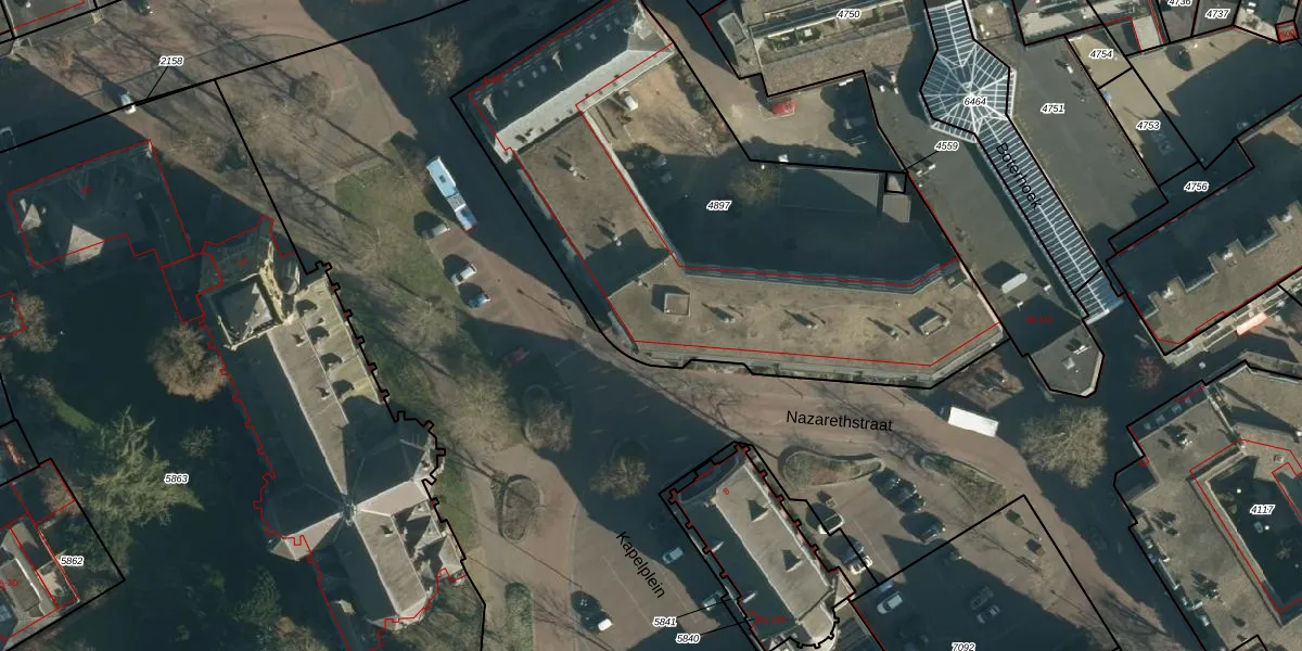 Het perceel waarop Nazarethstraat 59 staat heeft een oppervlakte van 2720 m². Dit is een zeer groot perceel. De perceeloppervlakte wordt geregistreerd door het Kadaster. Gedetailleerde informatie over de maten van dit perceel kunt u vinden in het rapport Kadastrale kaart met maatvoering van Nazarethstraat 59.