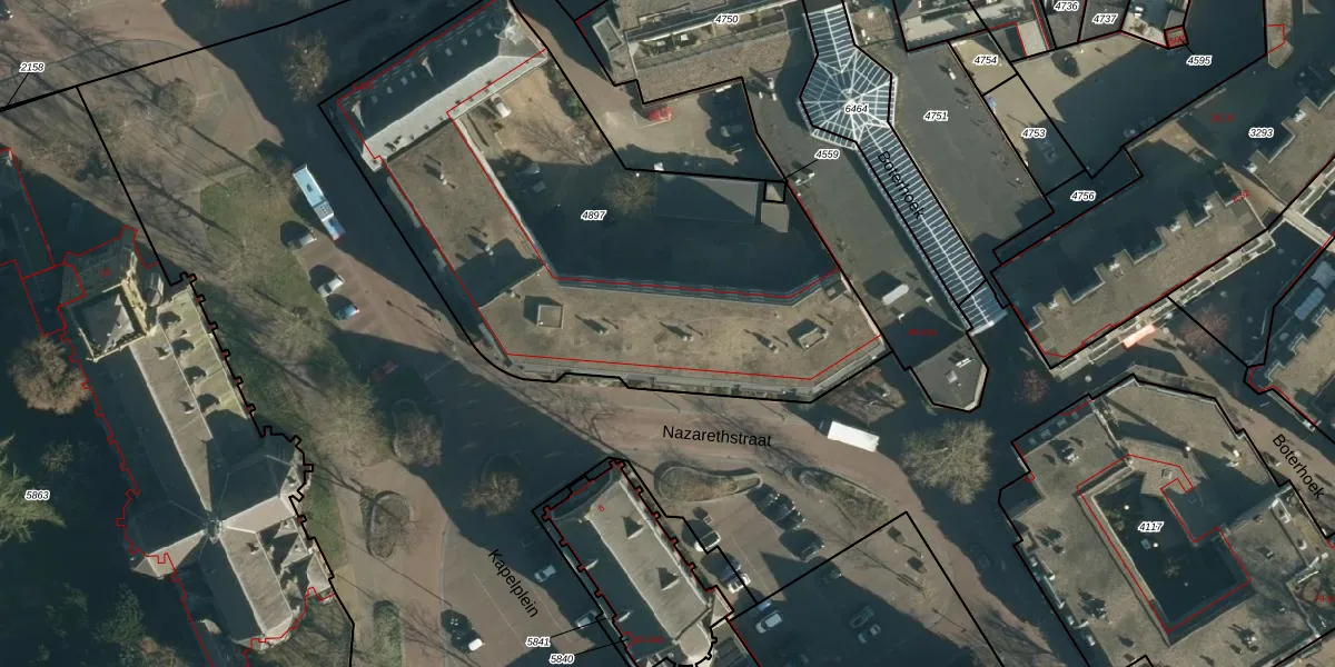 Het perceel waarop Nazarethstraat 87 staat heeft een oppervlakte van 2720 m². Dit is een zeer groot perceel. De perceeloppervlakte wordt geregistreerd door het Kadaster. Gedetailleerde informatie over de maten van dit perceel kunt u vinden in het rapport Kadastrale kaart met maatvoering van Nazarethstraat 87.