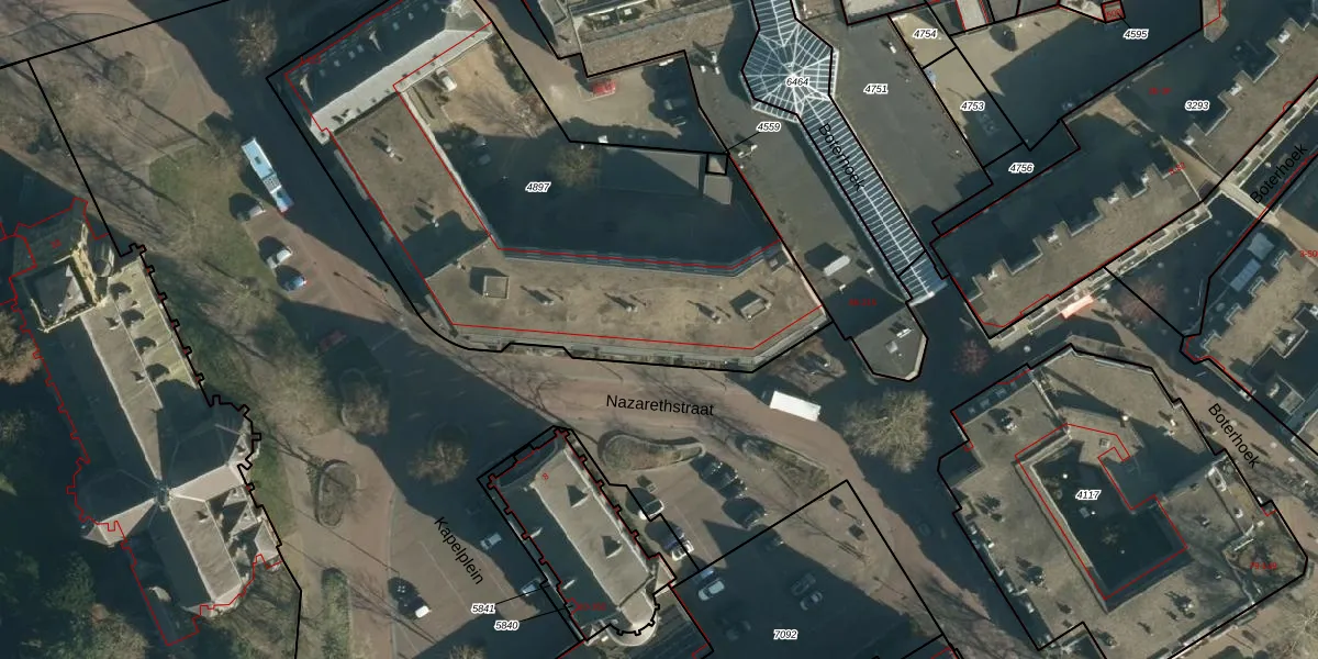 Het perceel waarop Nazarethstraat 97 staat heeft een oppervlakte van 2720 m². Dit is een zeer groot perceel. De perceeloppervlakte wordt geregistreerd door het Kadaster. Gedetailleerde informatie over de maten van dit perceel kunt u vinden in het rapport Kadastrale kaart met maatvoering van Nazarethstraat 97.