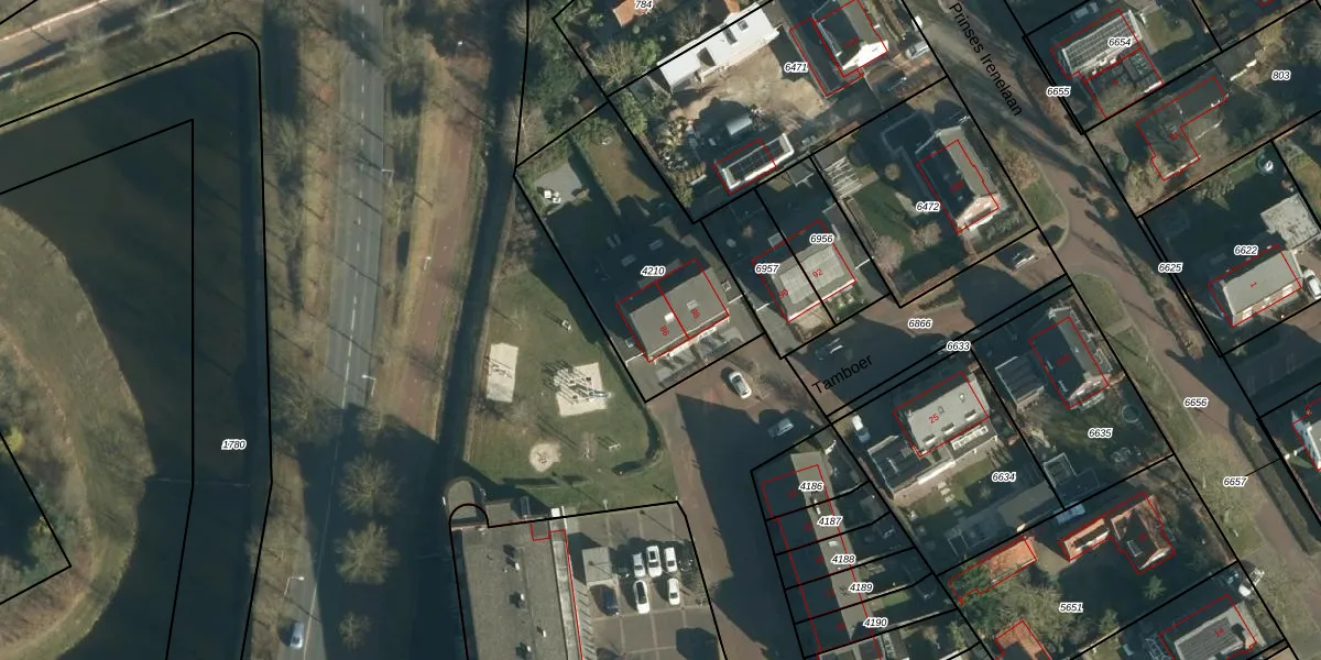 Het perceel waarop Tamboer 86 staat heeft een oppervlakte van 825 m². Dit is een groot perceel. De perceeloppervlakte wordt geregistreerd door het Kadaster. Gedetailleerde informatie over de maten van dit perceel kunt u vinden in het rapport Kadastrale kaart met maatvoering van Tamboer 86.