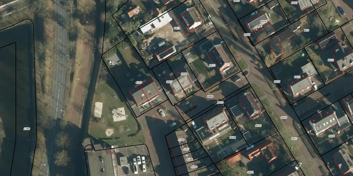 Het perceel waarop Tamboer 90 staat heeft een oppervlakte van 233 m². Dit is een middelgroot perceel. De perceeloppervlakte wordt geregistreerd door het Kadaster. Gedetailleerde informatie over de maten van dit perceel kunt u vinden in het rapport Kadastrale kaart met maatvoering van Tamboer 90.