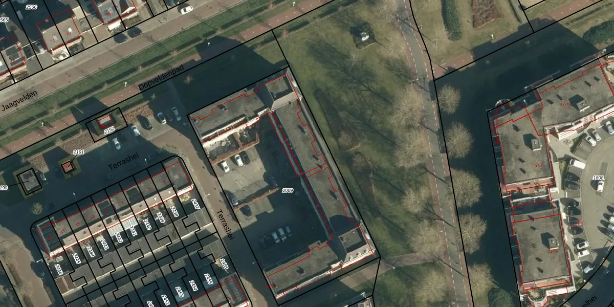 Het perceel waarop Terrashei 32 staat heeft een oppervlakte van 2544 m². Dit is een zeer groot perceel. De perceeloppervlakte wordt geregistreerd door het Kadaster. Gedetailleerde informatie over de maten van dit perceel kunt u vinden in het rapport Kadastrale kaart met maatvoering van Terrashei 32.