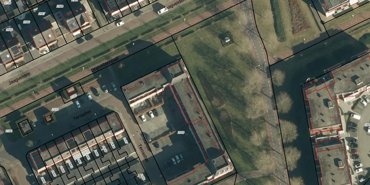 Het perceel waarop Terrashei 38 staat heeft een oppervlakte van 2544 m². Dit is een zeer groot perceel. De perceeloppervlakte wordt geregistreerd door het Kadaster. Gedetailleerde informatie over de maten van dit perceel kunt u vinden in het rapport Kadastrale kaart met maatvoering van Terrashei 38.